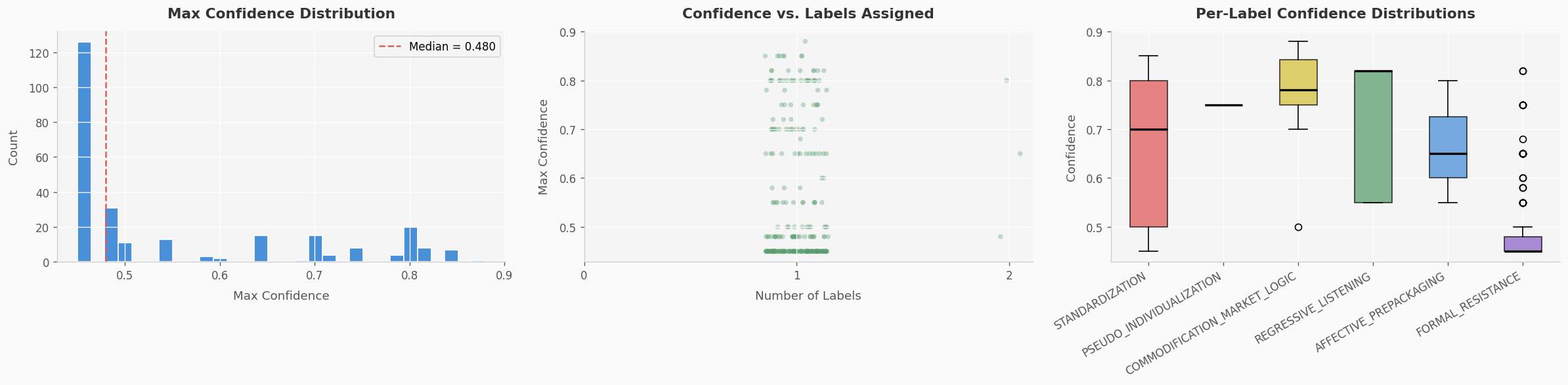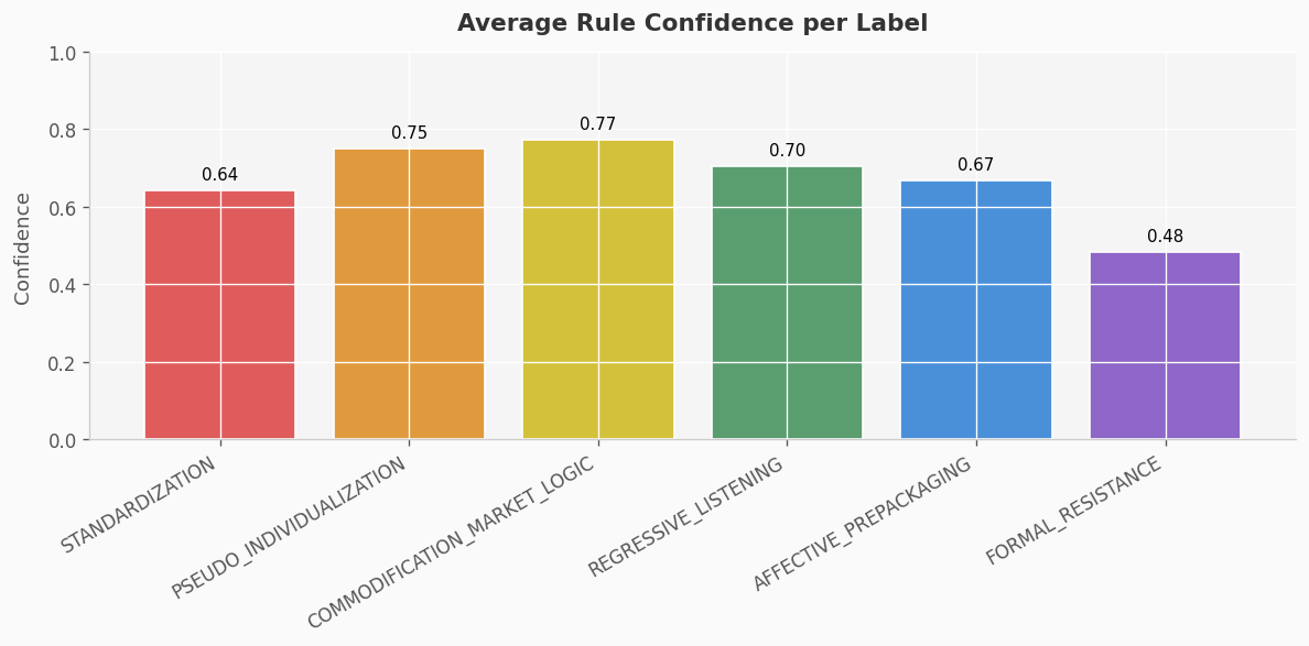 By contrast, COMMODIFICATION / MARKET LOGIC and PSEUDO_INDIVIDUALIZATION, while rare, score the highest average confidence — 0.77 and 0.75 respectively. When commenters articulate these critiques, they tend to do so with precision: “cash grab,” “corporate music genre,” “carbon copy.” The language is unambiguous.