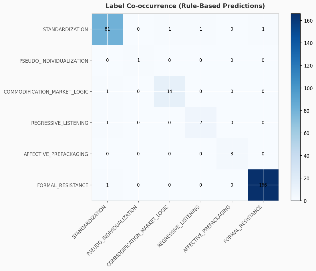 The co-occurrence matrix tells another story: labels almost never appear together. Only four comments in the entire corpus carry more than one critique label. Standardization co-occurs once each with Commodification, Regressive Listening, and Formal Resistance. Every other pairing is zero. This could mean the regex rules are too mutually exclusive — or it could mean that YouTube commenters, when they do engage critically, tend to focus on one dimension at a time.