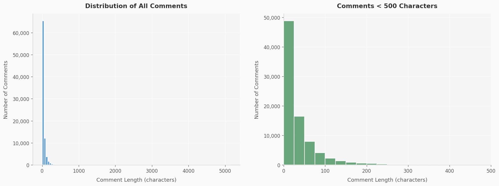 The answer is: overwhelmingly short. The median comment is 18 characters. The mean word count is 7.7. Nearly half the corpus — about 50,000 comments — is under 25 characters: emoji reactions, single words (“fire,” “mid”), timestamps, brief exclamations. Another 17% are trivial by any metric — too short or formulaic to carry any analytical content. If Adorno is right that the culture industry produces passive consumption, YouTube comment sections are exhibit A.