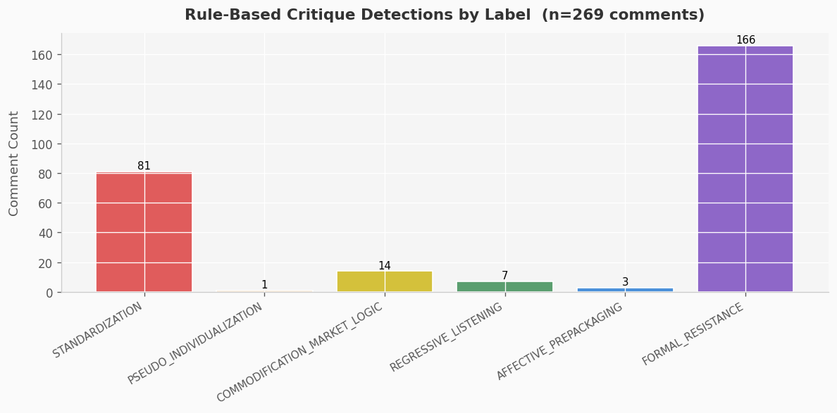 If the “For You” page really is the culture industry perfected — predicting desire, disguising conformity as choice, pre-giving the whole before the experience even begins — then its triumph is nearly total. Standardization dominates the critique categories, directly echoing Adorno’s central claim from 1941. Pseudo-individualization is the rarest label — and its rarity likely reflects how effectively it works as ideology, so naturalized that few listeners can name it. The comment sections themselves are products of the same algorithmic logic that Adorno’s Commodification label targets: the medium and the message converge.