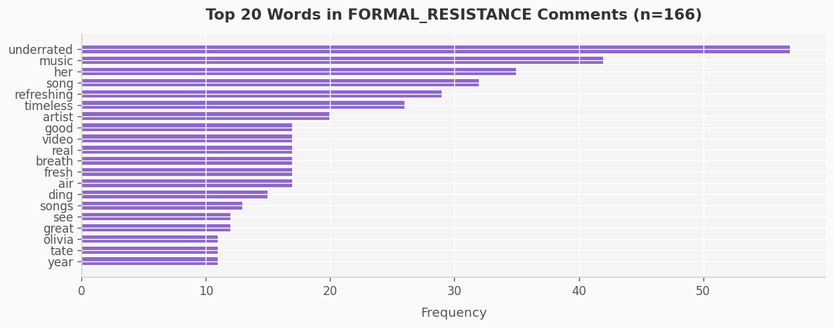 FORMAL RESISTANCE dominates the count at 166 hits — but this requires context. Its average confidence is the lowest of all labels at 0.48, barely above the classification threshold. Many of these are comments containing words like “underrated,” “timeless,” or “refreshing” — language that signals appreciation for perceived artistic quality but does not always constitute a rigorous counter-argument to the Culture Industry. The word “underrated” alone accounts for 57 of the 166 hits.