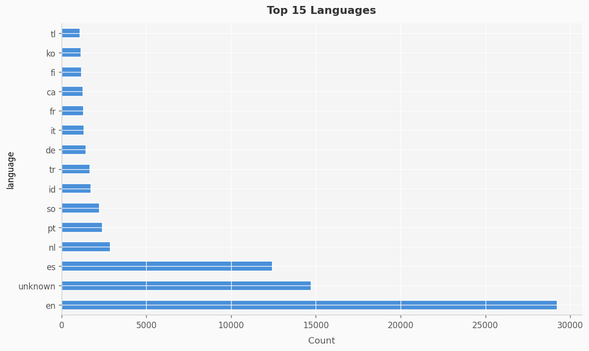 The artist mix matters. Five of the 15 tracks are Bad Bunny’s, which means the corpus is genuinely multilingual — roughly 29,000 comments in English, 12,500 in Spanish, and the rest scattered across Dutch, Portuguese, Indonesian, Korean, Tagalog, and a dozen other languages. About 15,000 comments were too short or emoji-heavy for reliable language detection at all.