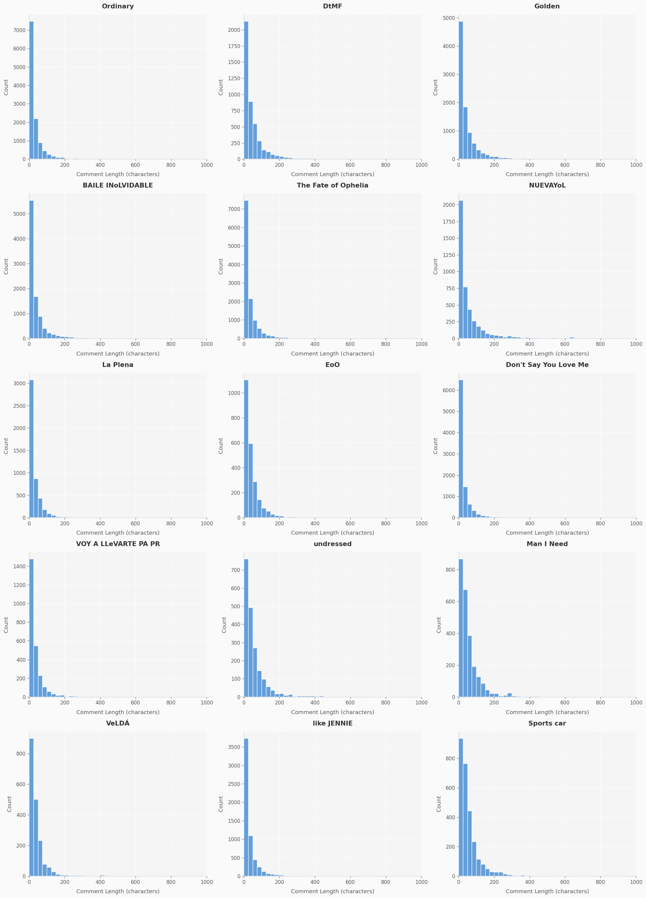 The data comes from a straightforward source: the Top Tracks of 2025 Global playlist on Spotify, which ranks the 50 most-streamed songs released that year. I pulled the top 15 and scraped every available YouTube comment from their official music videos using youtube-comment-downloader, sorted by popularity. The result was a corpus of 84,816 comments spanning artists from Alex Warren and Taylor Swift to Bad Bunny, Jin, JENNIE, and sombr.1