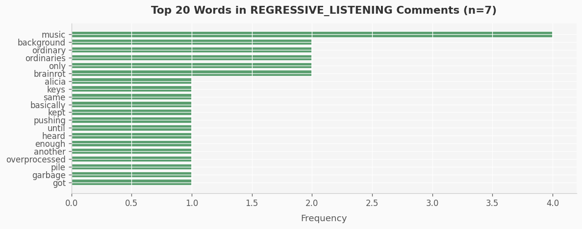 The pipeline flagged 7 comments under REGRESSIVE LISTENING (average confidence 0.70). The sample is small but the language is pointed: “its terrible, elevator music...” and “another ordinary overprocessed pile of garbage got a bunch of listens from the mass of braindead ordinaries” (@Dr_Darrow, on Alex Warren’s “Ordinary”).