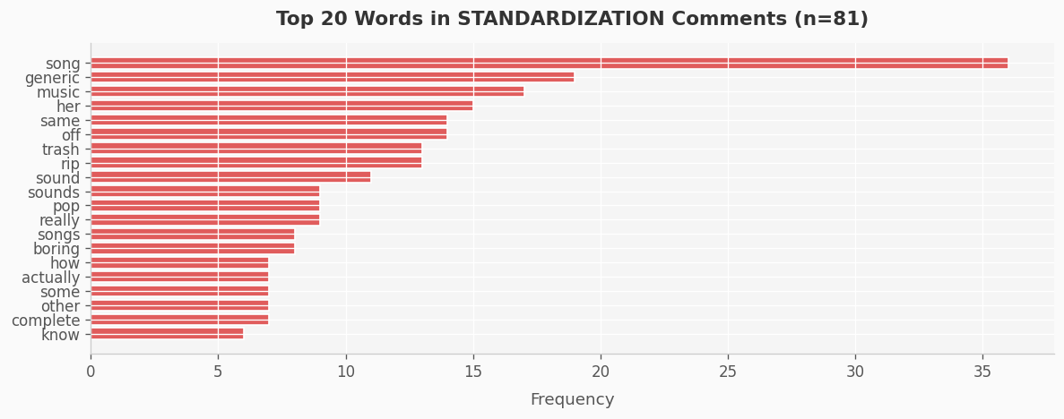 The 15 most-streamed songs of 2025 bear this out. The NLP pipeline flagged 81 comments under the STANDARDIZATION label, averaging a confidence score of 0.64. The telling detail is not just that the word “generic” appears but that it appears across completely different artists and genres: on Alex Warren’s “Ordinary” — “this is literally a basic radio song, is so generic” (@surferboypizza12); on Taylor Swift’s “The Fate of Ophelia” — “a generic boring comment for a generic boring song from a generic boring artist” (@dominichern9446); and on Tate McRae’s “Sports car” — “It actually sounds like generic K pop from like 5 years ago” (@azraksash). Listeners are picking up on something systemic, not pointing fingers at one bad song.