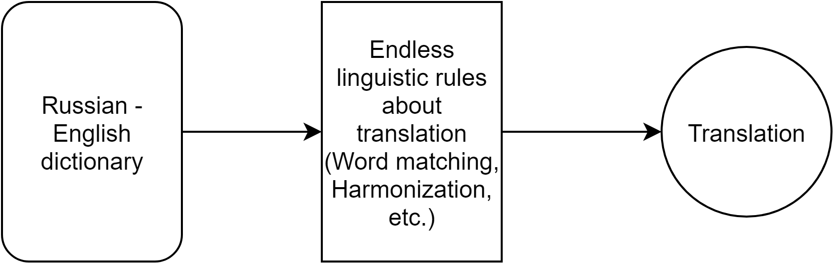 Figure 1 illustrates the process of Rule-Based Machine Translation, or RBMT. First, the text passes through a bilingual dictionary, then linguistic rules for the translation languages are applied to produce the final translation. Developments in computer hardware and software allowed for increasing bilingual dictionaries and hand-coded linguistic rules. However, RBMT was extremely hard to perfect as languages contain specific niches that are hard to account for. This is where machine learning enters the equation.