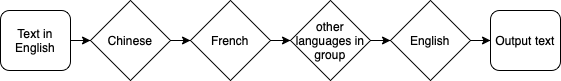 The process described above will be repeated to test the effects of translating through the languages multiple times, but instead of looping through the list once, the code will loop ten times through the language groups.