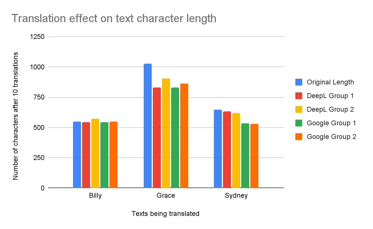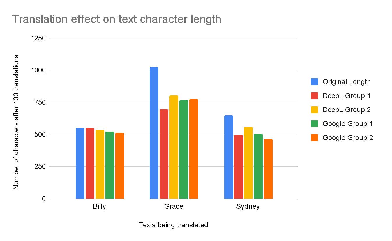 Figure 7 displays the number of characters before and after the text is translated 100 times. Much like with 10 translations, 100 translations led to significant decreases in the size of the texts. DeepL once more produced an unexpected result: Billy DeepL Group 1 increased from 550 → 551 compared to the original. Unlike with 10 translations, Grace DeepL Group 1 was the translation with most characters lost compared to the original, going from 1027 → 694, a 32.4% drop. Billy DeepL Group 2 had the smallest decrease in characters, from 550 → 537, a 2.3% drop.