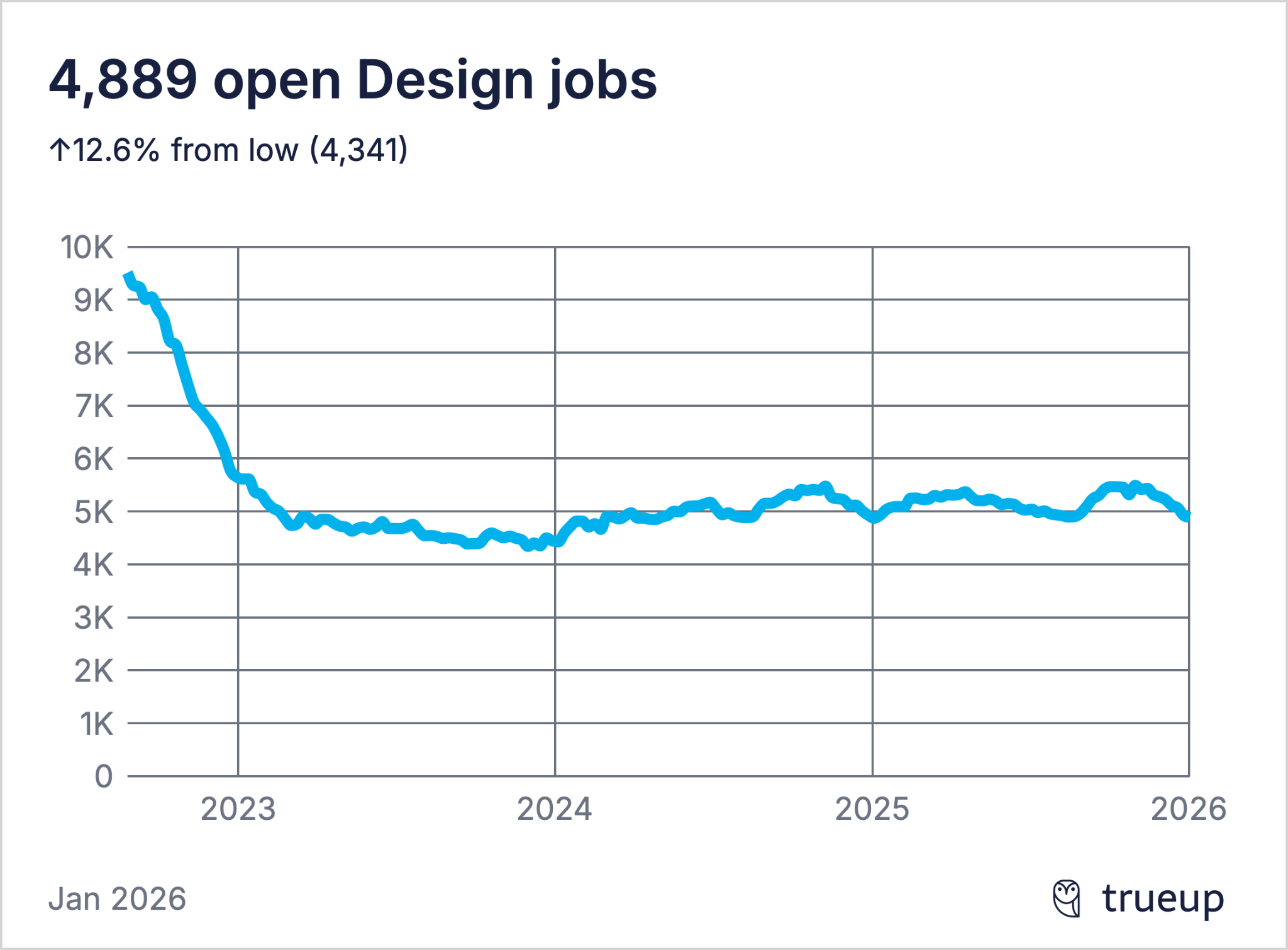 The design job market halved between mid-2022 and early 2023. Open design roles dropped from roughly 9,500 to about 4,300 — a 55% decline over 18 months.1 As of January 2026, the number sits at 4,889, which is 12.6% above the all-time low. It has effectively flatlined for two years.