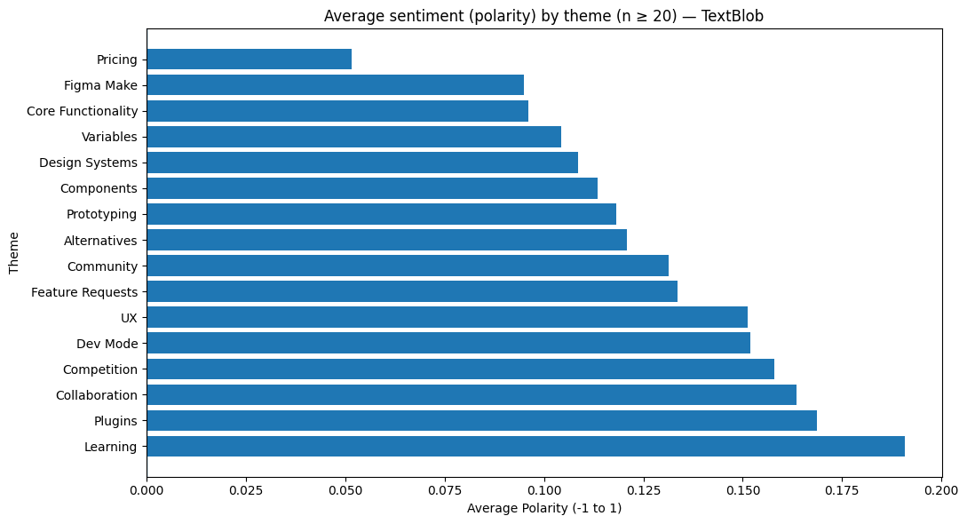 We also classified each entry into one of 16 discussion themes using regex pattern matching — things like ‘Pricing,’ ‘Figma Make,’ ‘Dev Mode,’ ‘Collaboration’ — and computed average polarity per theme for entries with at least 20 instances. That threshold filtered out low-signal topics and kept the comparisons statistically meaningful.