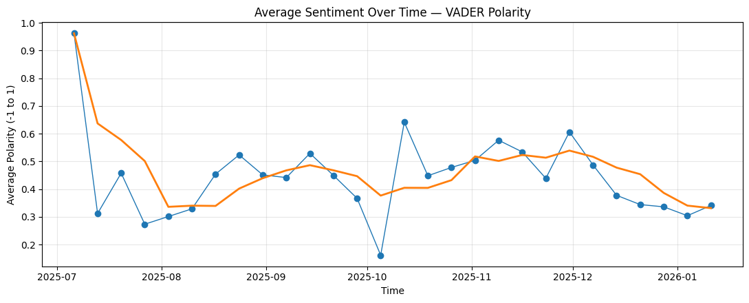 We used TextBlob6 and VADER (Valence Aware Dictionary and sEntiment Reasoner)7 in tandem — not because either is sufficient alone, but because they fail differently. TextBlob assigns sentiment by averaging the polarity scores of individual words from a general-purpose lexicon. It works reasonably well for formal text but treats a lot of internet language as neutral because the vocabulary isn’t in its training dictionary. VADER was specifically tuned for social media: it handles capitalization for emphasis, punctuation patterns (“!!!” vs “.”), colloquialisms, and negation sequences that trip up generic analyzers. Comparing both gives a more complete picture.
