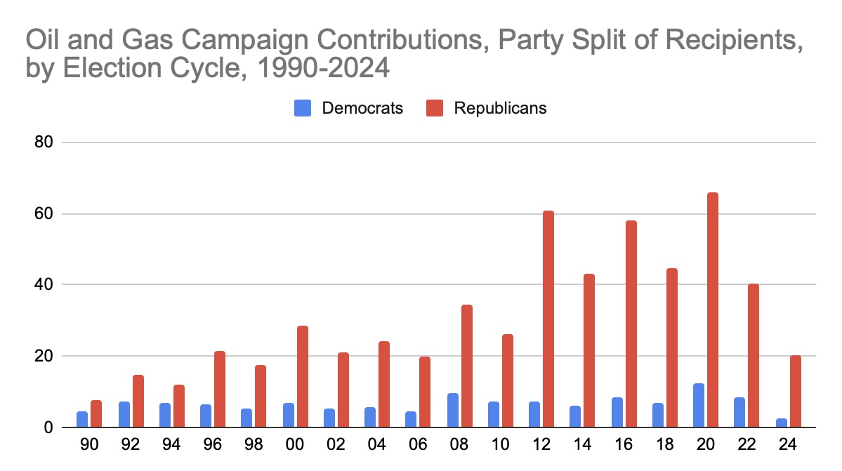 To identify these undecided legislators, one method interest groups can use is looking at campaign contributions and previous policy positions.1 Oil and gas are deeply connected with plastic production, as most plastics are made from natural gas and crude oil.2 The oil and gas industry contributes to Republican candidates far more than Democratic ones (Figure 1). This is largely because a majority of Democrats hold policy positions in support of environmental sustainability. Meanwhile, Republicans have historically supported deregulation and business interests over environmental protection.
